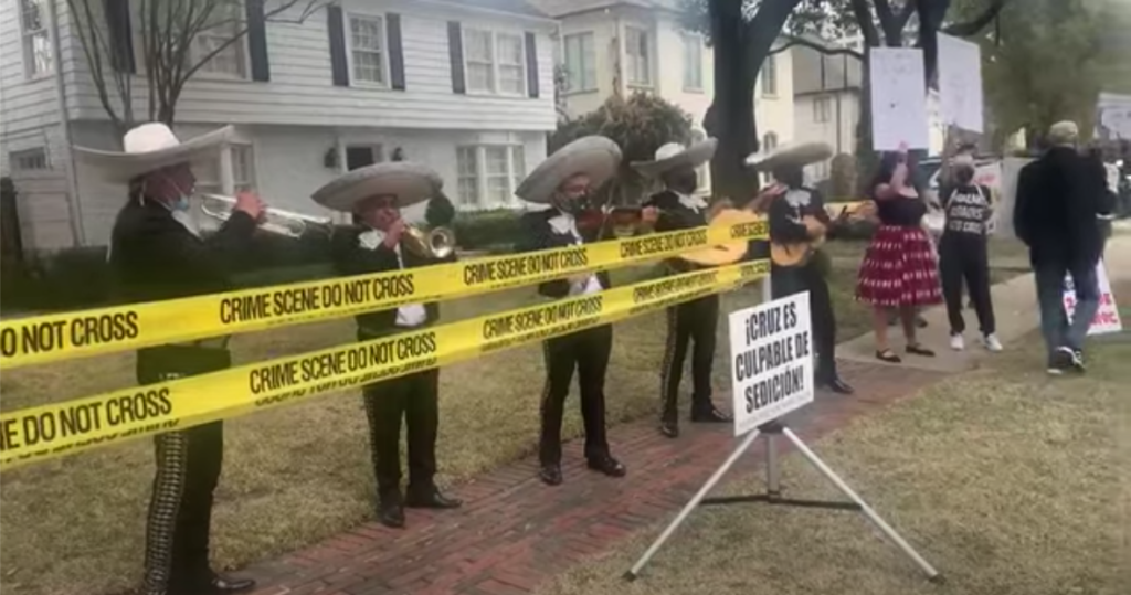 While millions of Texans were struggling in the cold without power and water, Senator Ted Cruz headed for sunny Cancun. He returned after news of the trip hit social media, sparking a protest outside his home with a mariachi band and protesters carrying signs reading “¡Cruz es culpable de sedición!”