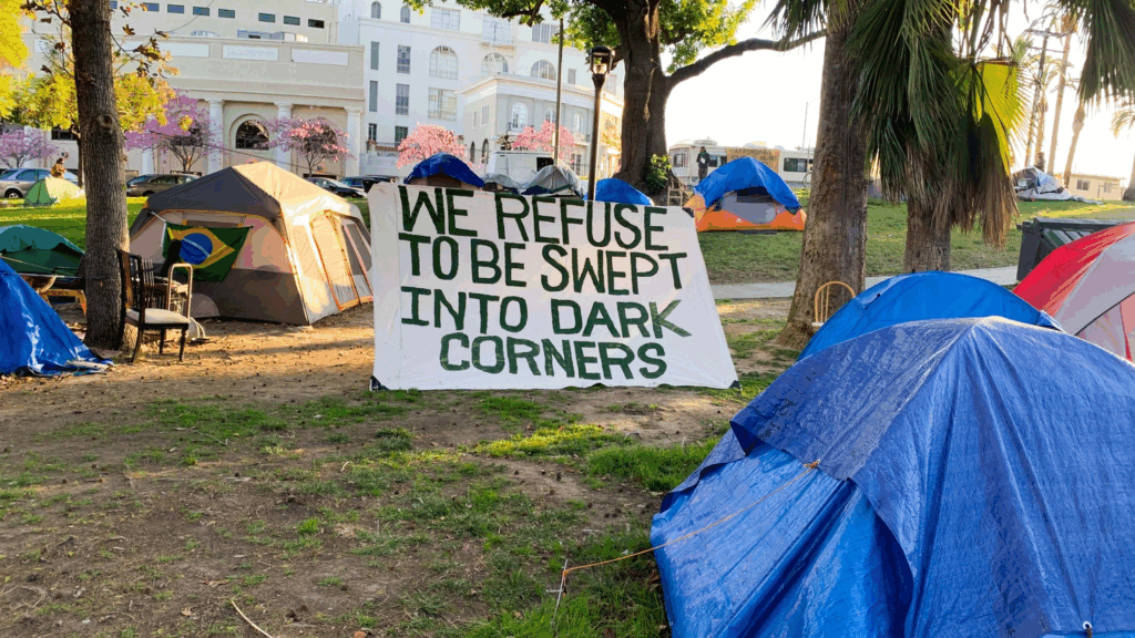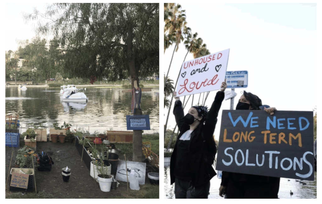 The housed and unhoused people of Echo Park created a mutual aid network, with a garden and job program. Ayman Ahmed was an unhoused resident at Echo Park and having found a sense of community support, he said, “It’s been so refreshing to live like a normal citizen again.”